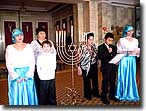 Наши девчонки и мальчишки продолжили поздравительную программу. Валерия Косырева посвятила празднику свои стихи: "Засветился свечек хоровод, чудеса живут на свете - Ханука идет!". Шестилетняя Эрнестина Снегиревская, под аккомпанемент Веры Васильевны Гринберг, исполнила веселую песенку "К нам гости пришли", особенно всем понравились слова: "А Хэсэд наш дружбой славится, приходите в гости к нам, если нравится!". Группа "Тамир" порадовала яркими танцами "Свечи", "Семь сорок", "Хава Нагила", "Мазл тов!", "Звезда Иерусалима" и другими.